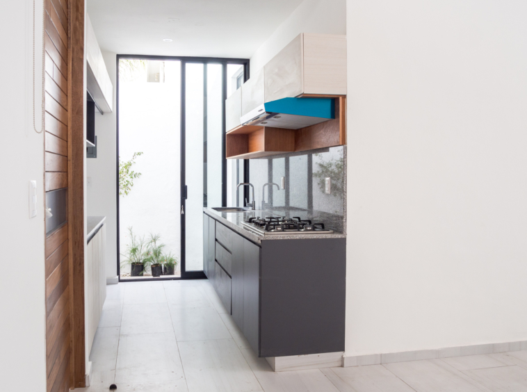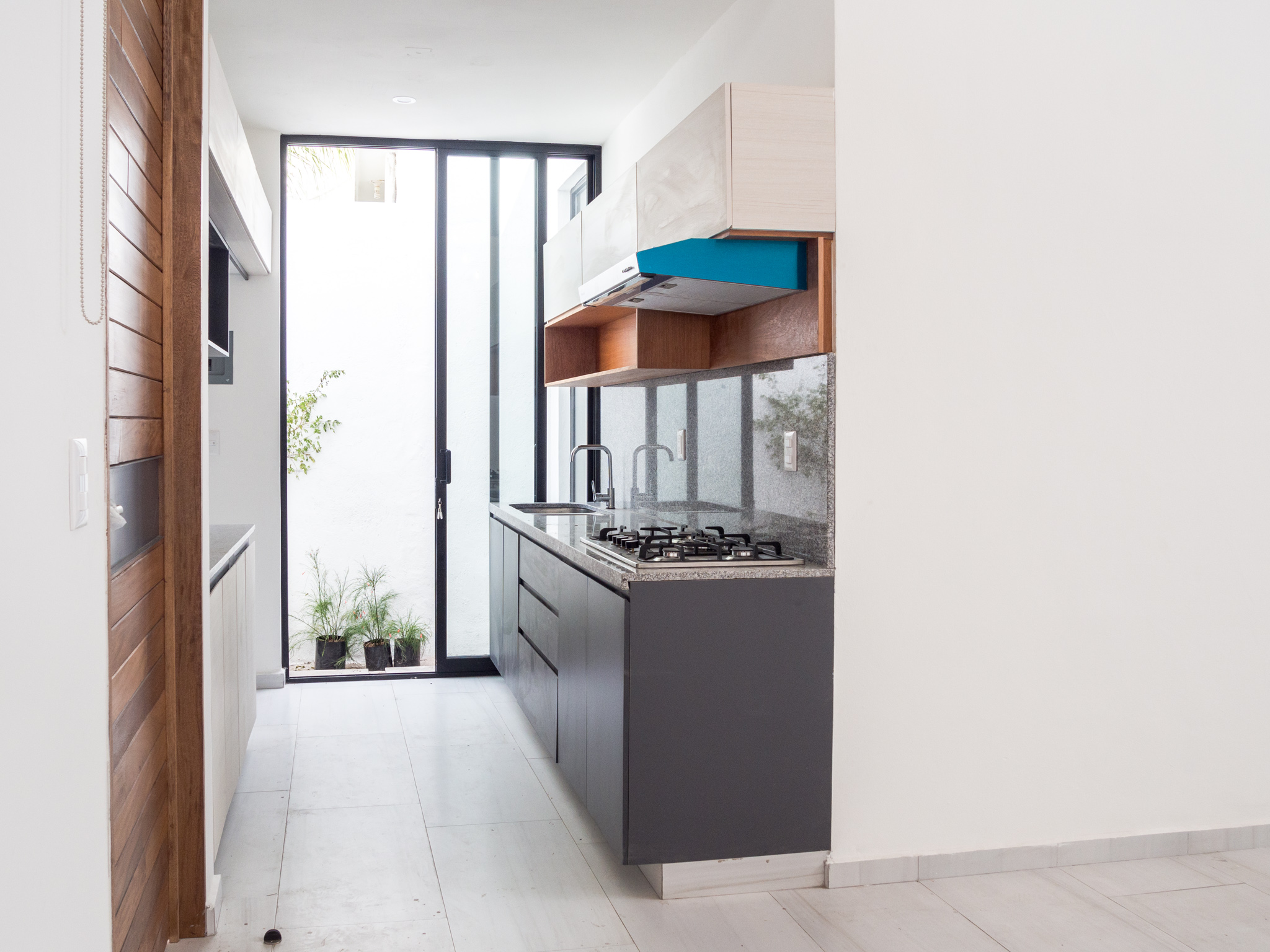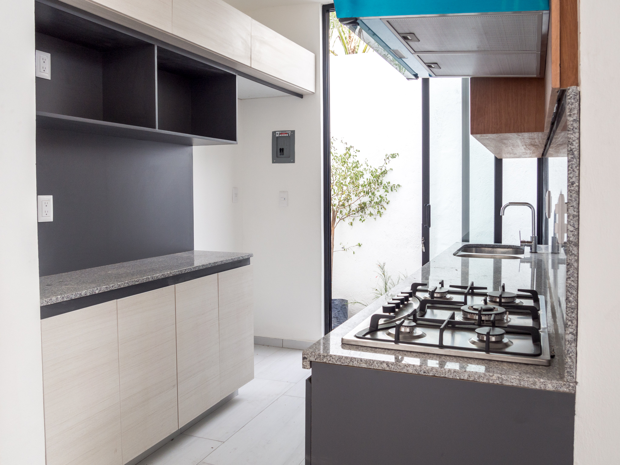 Cocina integral con barra de granito, parrilla y campana, puertas deslizables para mejor ventilación