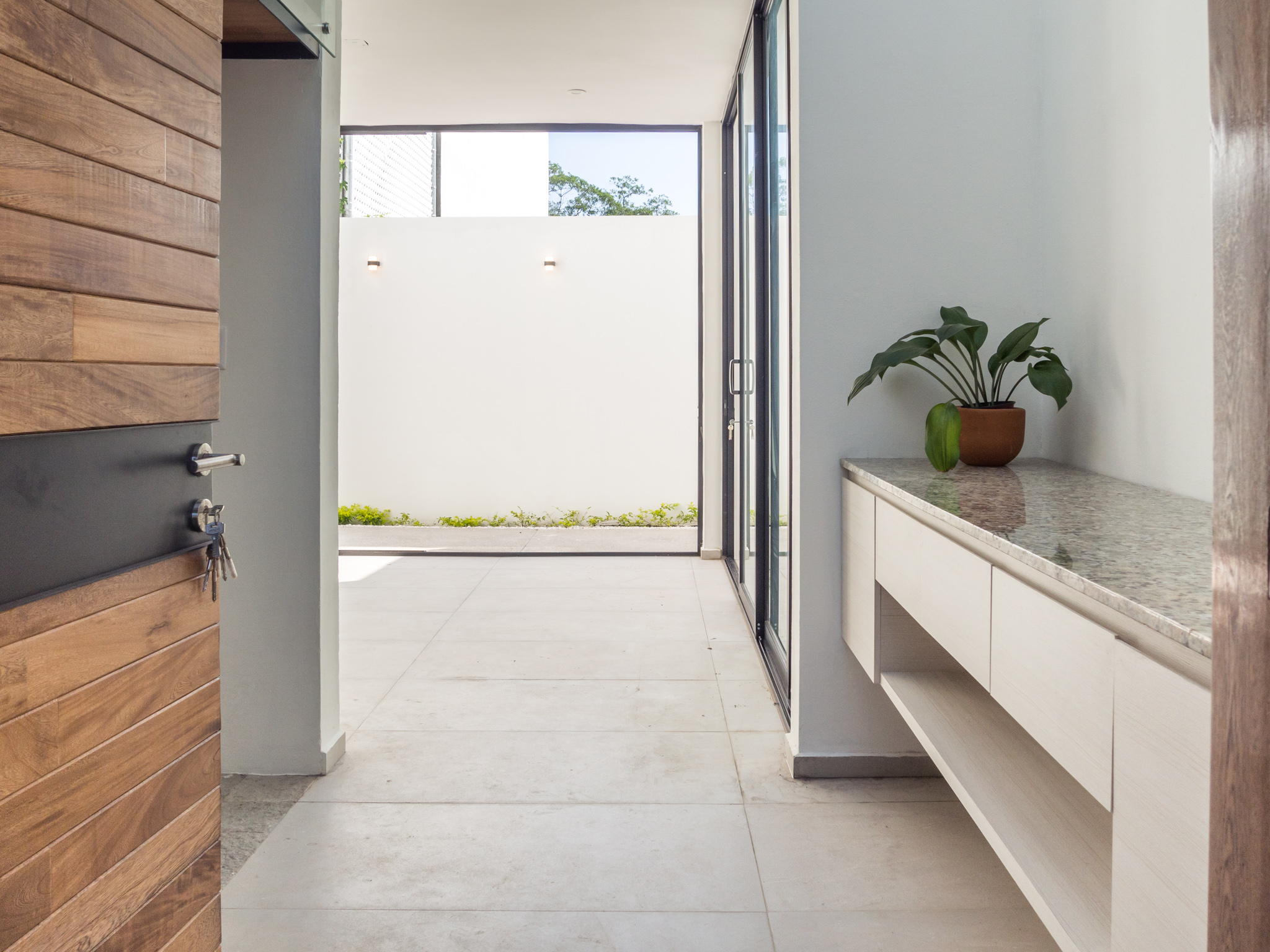 Modelo de 2 niveles con 3 recámaras ideal para familias, 1 recámara en planta baja con baño completo, diseño bioclimático que brinda un ahorro en consumo eléctrico, se mantiene mayor tiempo fresca, grandes espacios, uso de distintos materiales y acabados que logran una armonía y un espacio único para vivir,