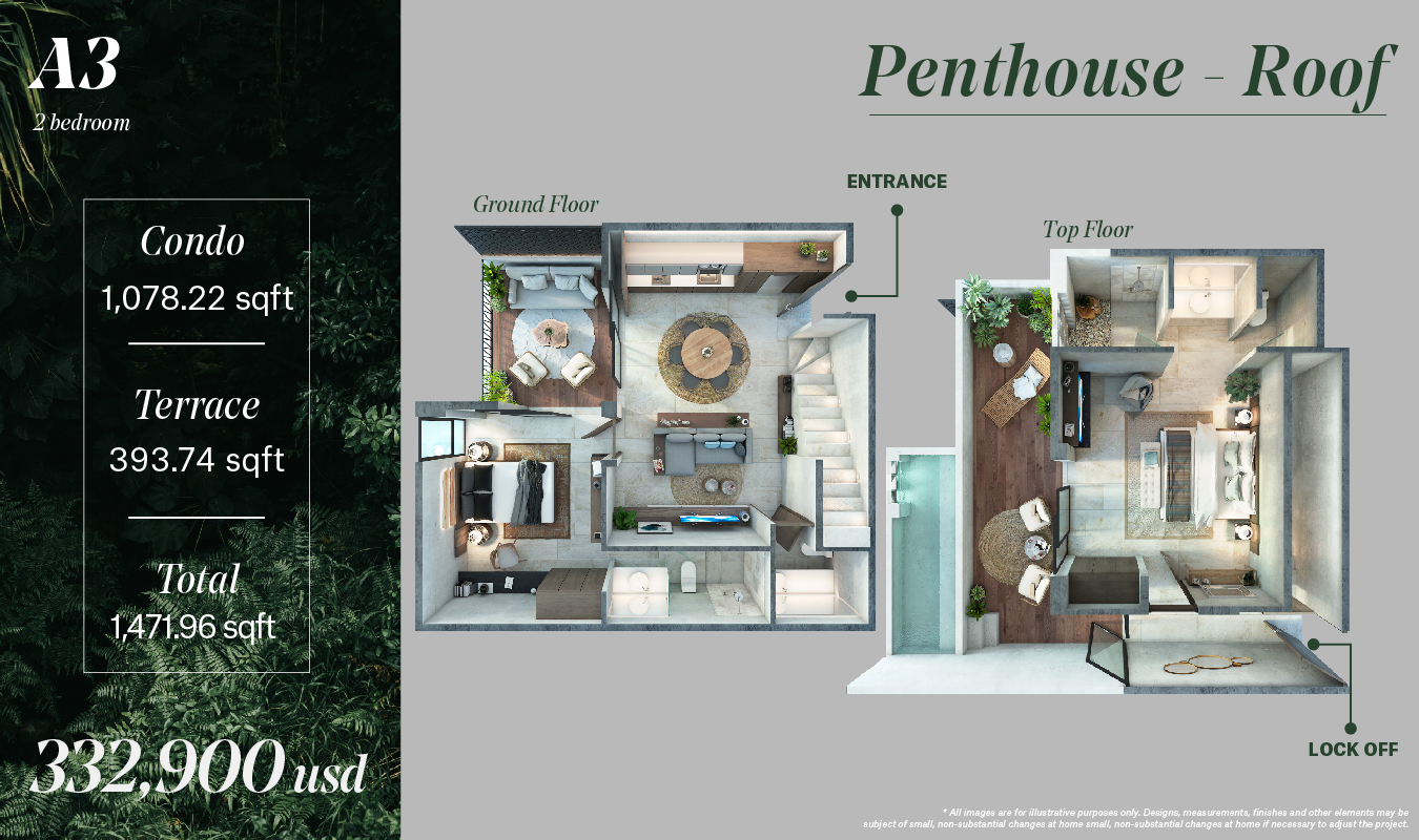 2 levels + 2 bedrooms + 2.5 bathrooms + 1 balcony terrace + private roof terrace with plunge pool